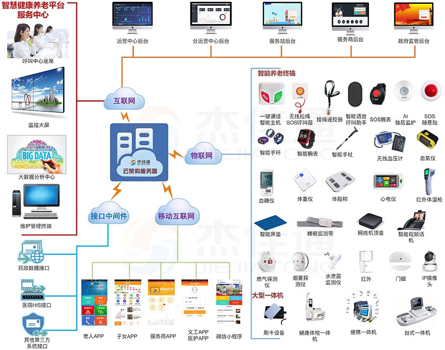 1)杰佳通智慧養(yǎng)老平臺(J3-HBCSP)具有上百項大功能模塊,幾百多項小的功能模塊。